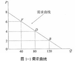 根據(jù)表1-1上的價格和需求量的各種組合,可以在一個縱軸代表價格,橫軸代表需求量的平面坐標上繪制出一條斜率為負的需求曲線,見圖1-1。