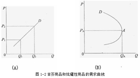 與吉芬商品不同,在圖l―2(B)中的D線是向后彎曲的炫耀性商品的需求曲線。實(shí)際上,我們可以把這條需求曲線上斜率為零的A點(diǎn)作為分界點(diǎn),將其分為兩段。顯然,A點(diǎn)以上的那半段需求曲線是符合需求法則的,因?yàn)樗男甭蕿樨?fù);而A點(diǎn)以下的那半段需求線是不符合需求法則的,因?yàn)樗男甭蕿檎?。斜率為正的需求曲線表明,商品的價(jià)格越高,需求量越大;反之,價(jià)格越低,需求量越小。