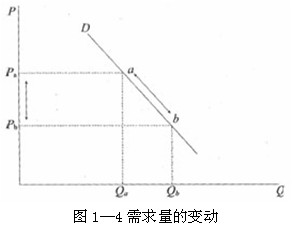 在圖1―4中,當(dāng)商品價格從Pa下降到Pb時,需求量從Qa增加到Qb,或沿著D線由a點移動到b點;當(dāng)商品價格從Pb上升到Pa時,需求量便相應(yīng)地從Qb減少到Qa,或沿著D線由a點移動到b點。