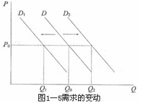 需求與需求量不同。既然需求是指在某一特定的時期和各種可能的價格水平上,消費者愿意并且能夠購買的商品數(shù)量,因此,需求不是指某一特定的需求量,而是指所有的特定的需求量的總和,即是說,它是一個完整的需求表。在坐標(biāo)上,需求不是指需求曲線上的某一點,而是指整條需求曲線。與此相聯(lián)系,需求的變動是指這樣一種狀態(tài):即在假定商品自身價格不變的情況下,由于其他因素的變化所引起的、在每一可能的價格水平上需求量變化的全部情況。因此,需求的變動是指整個需求表的變化,在坐標(biāo)上,它表現(xiàn)為整條需求曲線位置的移動。見圖1―5。