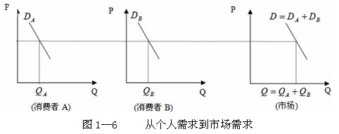 需求有個人需求與市場需求之分。個人需求也稱個別需求,是指在一定時期和每一種給定的價格水平上消費者個人愿意并且能夠購買的某種商品的數(shù)量;市場需求是指在一定時期和每一種給定的價格水平上所有消費者愿意并且能夠購買的某種商品的數(shù)量。據(jù)此可以推知,某種商品的市場需求量一定是每一價格水平上所有個人需求量之和;而某種商品的市場需求必定是所有消費者個人對該種商品的需求之和,因此市場需求曲線也一定是所有個人需求曲線的水平加總。