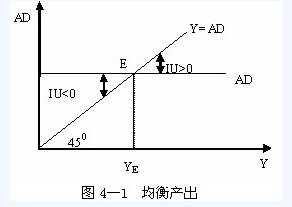 在圖4―1中,坐標(biāo)的縱軸代表總需求,橫軸代表總產(chǎn)出或國(guó)民收入。坐標(biāo)中的水平線(xiàn)是總需求曲線(xiàn),從原點(diǎn)出發(fā)的450線(xiàn)上的任意一點(diǎn)都代表國(guó)民收入等于總需求。根據(jù)定義,只有AD線(xiàn)與450線(xiàn)相交的E點(diǎn)所決定的國(guó)民收入才是均衡產(chǎn)出。在一個(gè)經(jīng)濟(jì)社會(huì)中,只有均衡產(chǎn)出才具有穩(wěn)定性,這是存貨變動(dòng)機(jī)制作用的結(jié)果。