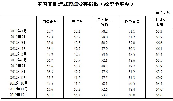 2012年12月中國非制造業(yè)商務(wù)活動(dòng)指數(shù)為56.1%
