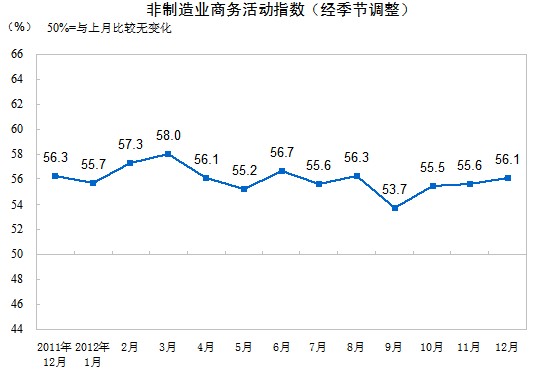 2012年12月,中國非制造業(yè)商務(wù)活動(dòng)指數(shù)為56.1%,比上月上升0.5個(gè)百分點(diǎn)。