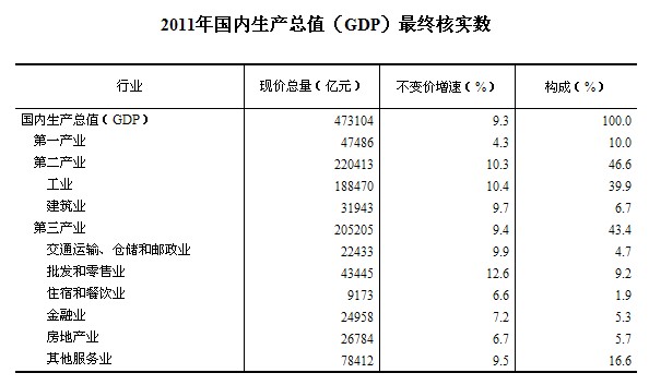 2011年GDP現(xiàn)價(jià)總量為473104億元,比初步核實(shí)數(shù)增加了222億元,按不變價(jià)格計(jì)算,比上年增長(zhǎng)9.3%,與初步核實(shí)數(shù)相同(詳見下表)。