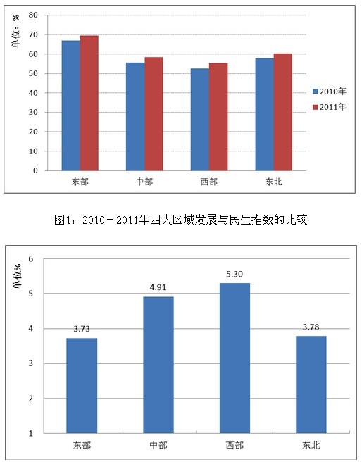 圖2:2011年四大區(qū)域發(fā)展與民生指數(shù)比上年增長比較