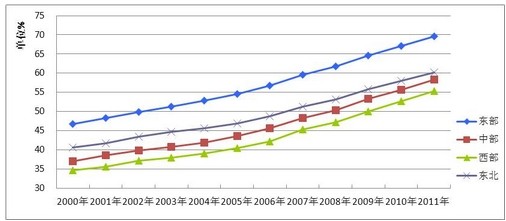 測算結(jié)果還表明,從2000年以來,我國四大區(qū)域發(fā)展與民生指數(shù)均穩(wěn)步提高。2011年與2000年相比,東部地區(qū)由46.66%提高到69.53%,中部地區(qū)由36.98%提高到58.33%,西部地區(qū)由34.61%提高到55.41%,東北地區(qū)由40.55%提高到60.22%(見圖3)。
