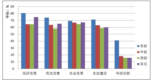 發(fā)展與民生指數(shù)由經(jīng)濟(jì)發(fā)展、民生改善、社會(huì)發(fā)展、生態(tài)建設(shè)和科技創(chuàng)新五個(gè)類別的分項(xiàng)指數(shù)組成,與2010年相比,2011年四大區(qū)域的各分項(xiàng)指數(shù)均有不同程度的提高。