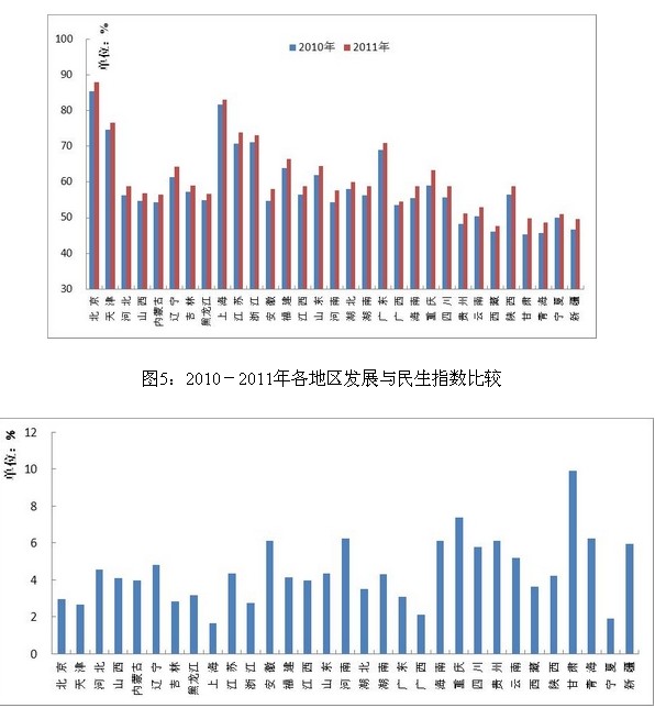 圖6:2011年各地區(qū)發(fā)展與民生指數(shù)比上年增長比較