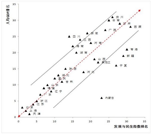 從2011年各地區(qū)發(fā)展與民生指數(shù)和人均GDP的比較來看,差異較大。有些省份人均GDP排序相對(duì)靠前,但發(fā)展與民生指數(shù)排序相對(duì)靠后,如內(nèi)蒙古、寧夏、新疆、青海等省;一些省份人均GDP排序雖然相對(duì)靠后,但發(fā)展與民生指數(shù)排序相對(duì)靠前,如四川、江西、海南、安徽等省(見圖8和附表3)。
