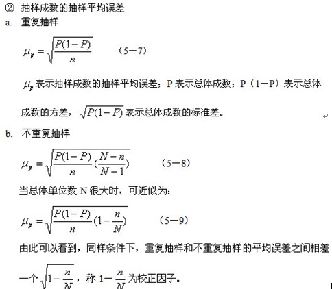 抽樣推斷的兩個(gè)主要目的:以樣本平均數(shù)推斷總體平均數(shù),以樣本成數(shù)推斷總體成數(shù)。同時(shí),在簡(jiǎn)單隨機(jī)抽樣時(shí)又有重復(fù)抽樣和不重復(fù)抽樣的兩種取樣方法。這樣,抽樣平均誤差也因此有如下度量的公式: