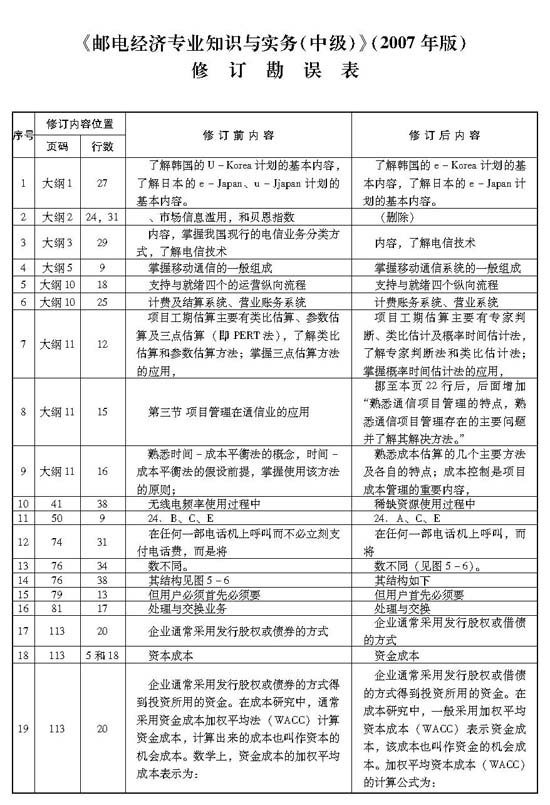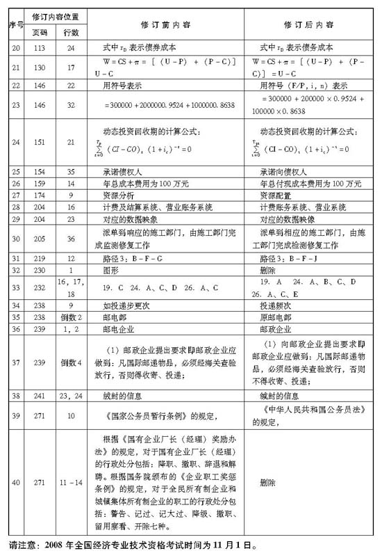 2008 年度全國(guó)經(jīng)濟(jì)專(zhuān)業(yè)技術(shù)資格考試時(shí)間定于11 月1 日。人事部人事考試中心根據(jù)社會(huì)經(jīng)濟(jì)發(fā)展和相關(guān)法規(guī)出臺(tái)的實(shí)際情況,針對(duì)2007 年版考試用書(shū)編校和印制中出現(xiàn)的問(wèn)題,2008 年經(jīng)濟(jì)考試用書(shū)做部分調(diào)整。其中,工商管理等9 個(gè)專(zhuān)業(yè)和經(jīng)濟(jì)基礎(chǔ)知識(shí)共20 種考試用書(shū)采取勘誤的方式進(jìn)行修訂(點(diǎn)擊查看人事考試中心通知原文件)。以下為中國(guó)人事出版社《郵電經(jīng)濟(jì)專(zhuān)業(yè)知識(shí)與實(shí)務(wù)(中級(jí))》(2007年版)教材勘誤內(nèi)容: