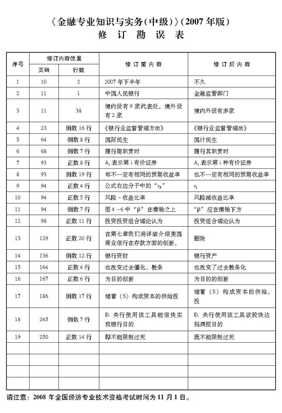 2008 年度全國經(jīng)濟專業(yè)技術(shù)資格考試時間定于11 月1 日。人事部人事考試中心根據(jù)社會經(jīng)濟發(fā)展和相關(guān)法規(guī)出臺的實際情況,針對2007 年版考試用書編校和印制中出現(xiàn)的問題,2008 年經(jīng)濟考試用書做部分調(diào)整。其中,工商管理等9 個專業(yè)和經(jīng)濟基礎(chǔ)知識共20 種考試用書采取勘誤的方式進行修訂(點擊查看人事考試中心通知原文件)。以下為中國人事出版社《金融專業(yè)知識與實務(wù)(中級)》(2007年版)教材勘誤內(nèi)容: