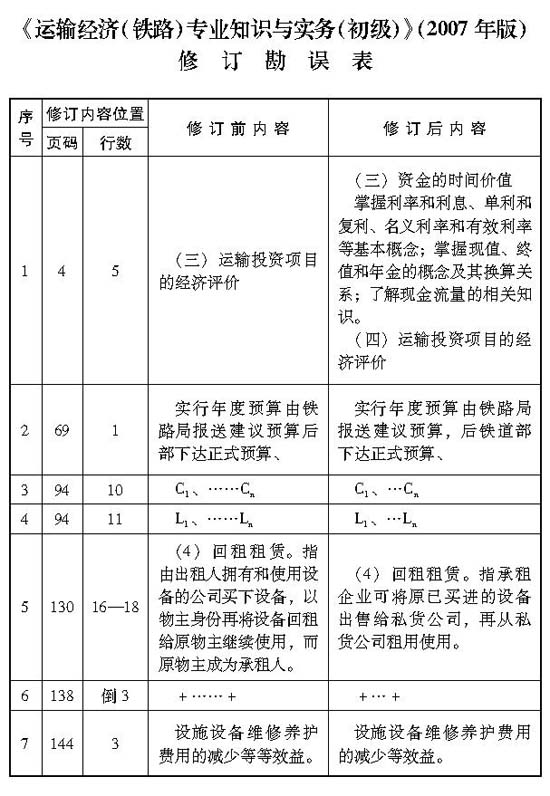 2008 年度全國經(jīng)濟專業(yè)技術(shù)資格考試時間定于11 月1 日。人事部人事考試中心根據(jù)社會經(jīng)濟發(fā)展和相關(guān)法規(guī)出臺的實際情況,針對2007 年版考試用書編校和印制中出現(xiàn)的問題,2008 年經(jīng)濟考試用書做部分調(diào)整。其中,工商管理等9 個專業(yè)和經(jīng)濟基礎(chǔ)知識共20 種考試用書采取勘誤的方式進行修訂(點擊查看人事考試中心通知原文件)。以下為中國人事出版社《運輸經(jīng)濟(鐵路)專業(yè)知識與實務(wù)(初級)》(2007年版)教材勘誤內(nèi)容: