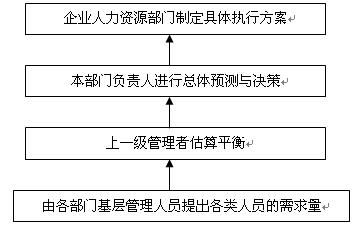 管理人員判斷法是由企業(yè)的各級(jí)管理人員,根據(jù)自己工作中的經(jīng)驗(yàn)和對(duì)企業(yè)未來(lái)業(yè)務(wù)量增減情況的直覺(jué)考慮,自下而上地確定未來(lái)所需人員的方法。如下圖所示: