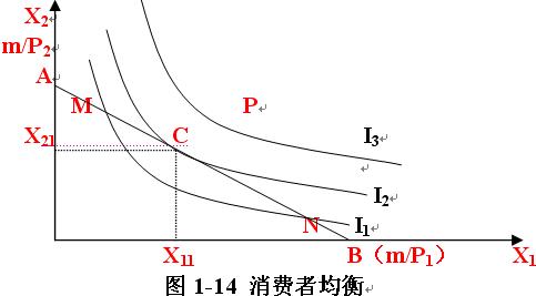 (切點(diǎn)C既位于預(yù)算線上又位于無(wú)差異曲線上,所以在此點(diǎn)無(wú)差異曲線的斜率恰好等于預(yù)算線的斜率,預(yù)算線的斜率的絕對(duì)值是商品價(jià)格比,無(wú)差異線斜率絕對(duì)值是商品邊際替代率,所以消費(fèi)者效用最大化的均衡條件是商品邊際替代率=商品的價(jià)格之比。)