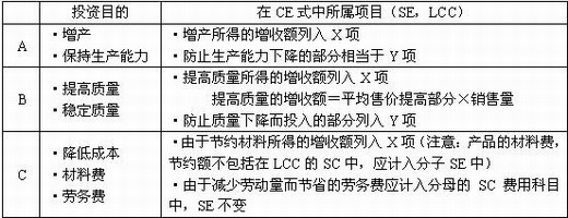 投資的目的是多種多樣的,當(dāng)計算費(fèi)用效率CE時,哪些應(yīng)作為投資所得的“成果”計入系統(tǒng)效率SE(分子要素),哪些應(yīng)計入壽命周期成本LCC(分母要素),有時是難以區(qū)分的。因此,可采用如下方式加以區(qū)分。