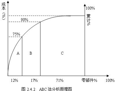 (2)ABC分析法。又稱重點選擇法或不均勻分布定律法,是指應(yīng)用數(shù)理統(tǒng)計分析的方法來選擇對象。在價值工程中,這種方法的基本思路是:首先將一個產(chǎn)品的各種部件(或企業(yè)各種產(chǎn)品)按成本的大小由高到低排列起來,然后繪成費用累積分配圖(如圖2.4.2所示)。然后將占總成本70%—80%而占零部件總數(shù)10%—20%的零部件劃分為A類部件;將占總成本5%—10%而占零部件總數(shù)60%—80%的零部件劃分為C類;其余為B類。其中A類零部件是價值工程的主要研究對象。