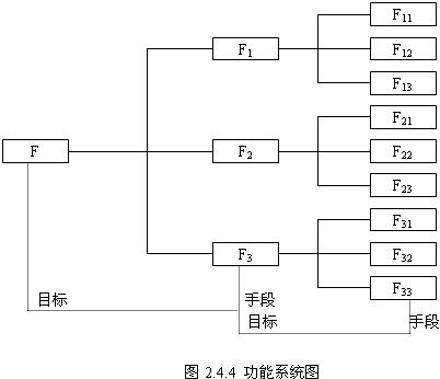 在圖2.4.4中,從整體功能F開始,由左向右逐級(jí)展開,在位于不同級(jí)的相鄰兩個(gè)功能之間,左邊的功能(上級(jí))是右邊功能(下級(jí))的目標(biāo),而右邊的功能(下級(jí))是左邊功能(上級(jí))的手段。