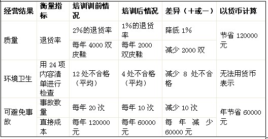 2.亞飛皮鞋廠在生產(chǎn)經(jīng)營中曾出現(xiàn)三個問題。第一,每年生產(chǎn)的皮鞋有2%由于質(zhì)量太差而被退貨;第二,車間生產(chǎn)作業(yè)環(huán)境不好,如車問地上的釘子可能會傷到員工;第三,可避免的事故發(fā)生率高于行業(yè)平均水平。為解決這些問題,廠部對管理人員進行了如下培訓:(1)開展與質(zhì)量問題、員工不良習慣有關(guān)的績效管理和人際關(guān)系技能培訓;(2)如何表彰績效有提高的員工。一線主管人員、輪班監(jiān)督人員和經(jīng)理層共40人參加了由公司培訓教師主講的為期2周的培訓課程。培訓在工廠附近的一家酒店內(nèi)進行。培訓項目是從一家咨詢機構(gòu)引進的,其中包括了錄像資料和專用教材。而且.該項目的指導者是一名培訓老師。有關(guān)資料如表1和表2所示。