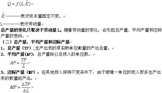 一般假定基本投資一定,即廠房、機(jī)器設(shè)備等在某一時期內(nèi)不能變化,只能改變使用的勞動力數(shù)量,來調(diào)整企業(yè)的產(chǎn)量時,企業(yè)的選擇及其合理性。一種可變要素的生產(chǎn)函數(shù)也稱短期生產(chǎn)函數(shù),基本形式為: