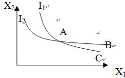 A、B均位于I2,AB偏好相同;BC均位于 I1,BC偏好形同,根據(jù)偏好的可傳遞性,B與C的偏好相同,但這是不可能的,因?yàn)锽比C具有更多的X2,根據(jù)多多益善假定,B必定比C更受偏好。因此無(wú)差異曲線不能相交。