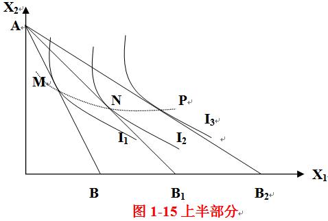 (1)MNP連接起來得到一條價格-消費曲線,表示消費者偏好和收入不變時,與一種商品價格變化相聯(lián)系的兩種商品在不同價格下的效用最大化組合。