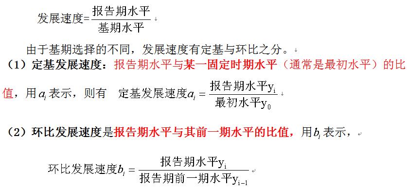 1、發(fā)展速度:是以相對(duì)數(shù)形式表示的兩個(gè)不同時(shí)期發(fā)展水平的比值,表明報(bào)告期水平已發(fā)展到基期水平的幾分之幾或若干倍。