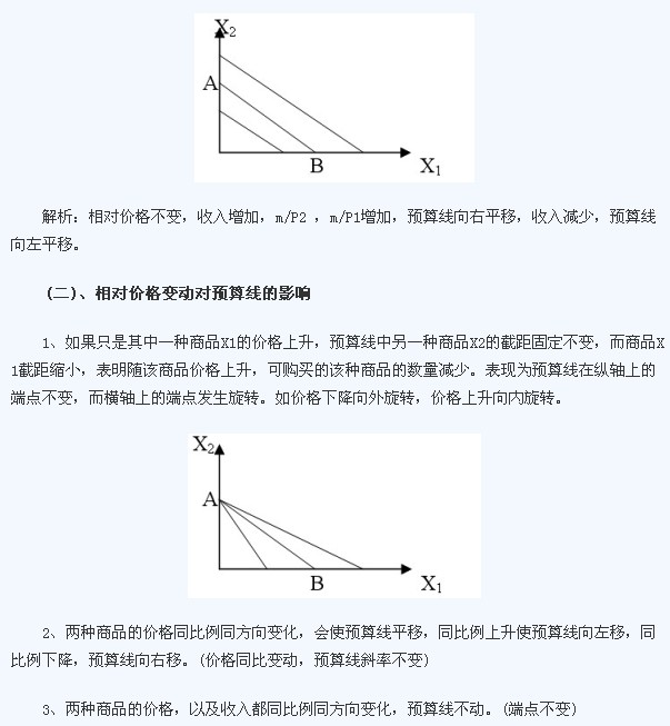 在相對價格不變的情況下,收入改變,會使預算線出現(xiàn)平行移動。收入增加使預算線向右平移,收入減少使預算線向左平移。