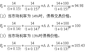 例:現(xiàn)有年收益率為14%每年付息一次的債券,面額100元,期限10年。當(dāng)市場利率為15%時則交易價格: