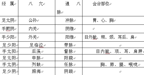 八脈交會穴表