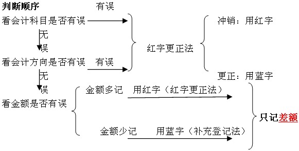 更正方法一般有劃線(xiàn)更正法、補(bǔ)充登記法、紅字沖正法三種;