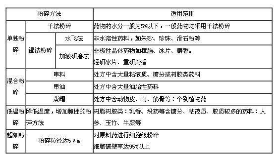 系將干燥藥材直接粉碎的方法。藥材應(yīng)先采用曬干、陰干、烘干等方法充分干燥再進(jìn)行粉碎。根據(jù)藥材特性可采用混合粉碎、單獨(dú)粉碎或特殊處理后混合粉碎。