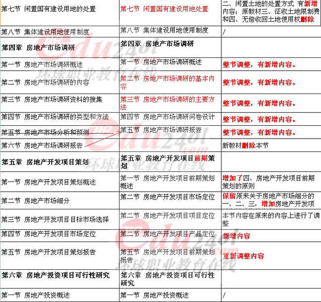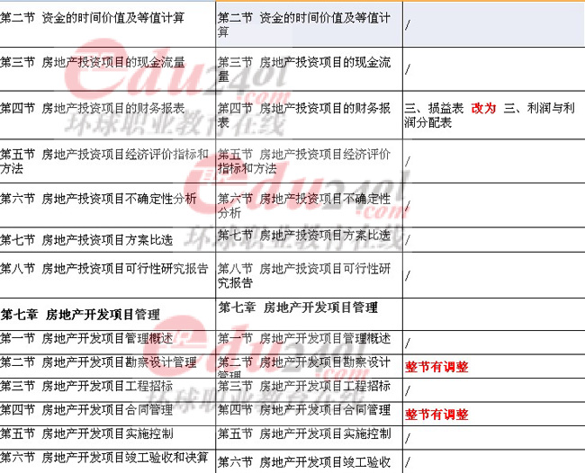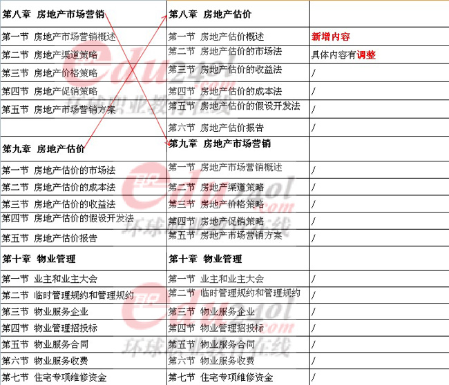 總得來說,今年房地產經濟的教材變動還是比較多的,最顯著的一個變動地方是“舊瓶裝新酒”,就是很多章節(jié)的名稱沒有變化,但實際具體的內容卻發(fā)生了不小的變化,例如第四章 房地產市場調研,這章從目錄上看和12年的教材沒有區(qū)別,但是翻到具體的小節(jié)內容,就會發(fā)現(xiàn),和12年差別非常大。本次的新教材還有一個顯著的變化,就是教材的編排上,既有小章節(jié)的內容重組,也有個別章節(jié)在書中的順序進行了調整。例如元教材中第八九章內容順序調換,還有第十一章中原來的幾個小節(jié)合并成一節(jié)等等變化。具體的情況請參看下面的表格。