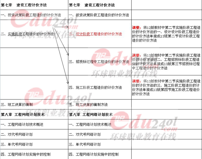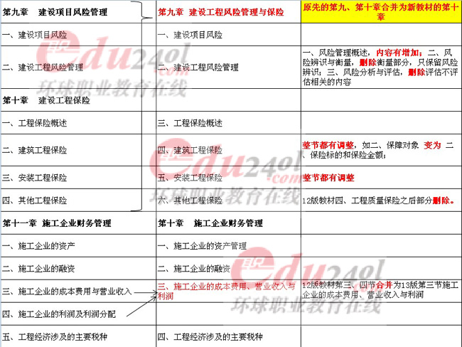 2013年中級經(jīng)濟師的教材千呼萬喚,終于出來了。環(huán)球網(wǎng)校第一時間拿到了建筑經(jīng)濟專業(yè)知識與實務(wù)(中級)的教材,并與2012版的教材一一進行了對比??傮w來說,今年的教材變動不如調(diào)整多,如第七章將原來的第二小節(jié)拆分成了三個小節(jié),第九章和第十章合并成了新教材的第九章,第十二章將第二、三、四小節(jié)的順序重新排列了。當然,整體變動雖小,但是第四章相對來說,變動算是整本書最大的地方了,尤其是第二節(jié)的內(nèi)容,大家要重點關(guān)注一下。此外,新教材還糾正了一些12版教材編排上的一些小錯誤,還有就是一些章節(jié)增加了一下實例。
