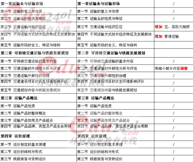 總得來(lái)說(shuō),鐵路的教材變化不大的。初拿到教材,對(duì)比目錄,發(fā)現(xiàn)只有一處有明顯變化的地方,第十五章 鐵路運(yùn)輸服務(wù)質(zhì)量管理增加第五節(jié) 動(dòng)車組列車及高鐵車站相關(guān)服務(wù)質(zhì)量規(guī)范。翻到教材里面,變化其實(shí)也不大?;揪褪且恍┬」?jié)里,或增加或刪除或重新編排原教材的內(nèi)容,例如第一章運(yùn)輸業(yè)與運(yùn)輸市場(chǎng),第三節(jié) 交通運(yùn)輸與經(jīng)濟(jì)區(qū)位增加 五、亞歐大陸橋;第二章 可持續(xù)交通運(yùn)輸與鐵路發(fā)展規(guī)劃,第二節(jié) 交通運(yùn)輸?shù)耐獠啃苑治雠c評(píng)估,有細(xì)小部分內(nèi)容調(diào)整;第五章 企業(yè)財(cái)務(wù)管理 ,第一節(jié) 企業(yè)財(cái)務(wù)管理概述,本節(jié)重新編排;第十五章 鐵路運(yùn)輸服務(wù)質(zhì)量管理,第三節(jié) 運(yùn)輸服務(wù)質(zhì)量,有刪除內(nèi)容等等。具體的變化情況請(qǐng)?jiān)斠?jiàn)下表。