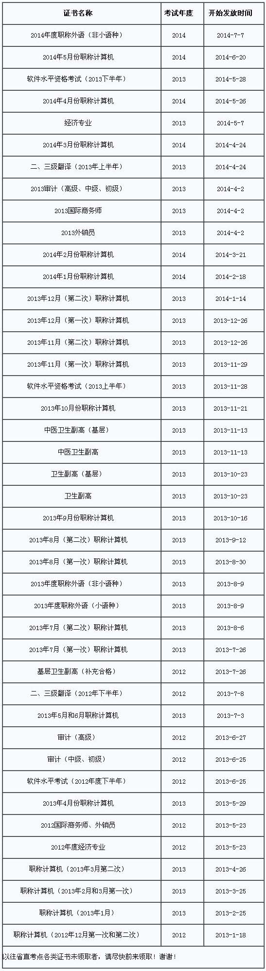 全國計算機(jī)應(yīng)用能力考試(1-12月份)、全國職稱外語考試、衛(wèi)生專業(yè)副高級考試、計算機(jī)技術(shù)與軟件(水平)考試、審計專業(yè)、經(jīng)濟(jì)專業(yè)、國際商務(wù)師、外銷員、二、三級翻譯資格(筆譯),具體開始發(fā)放時間請看列表公布的動態(tài)通知。