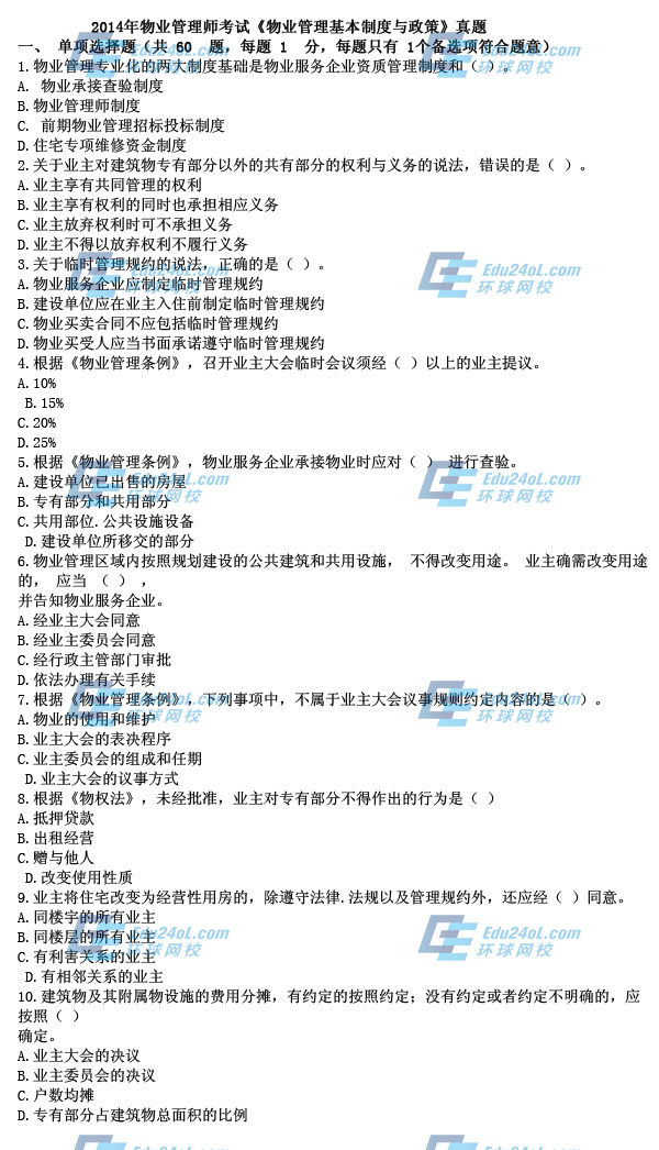 2014物業(yè)管理師《制度與政策》真題(文字版)