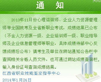 江西省2013年11月心理咨詢師全國統(tǒng)考成績查詢通知