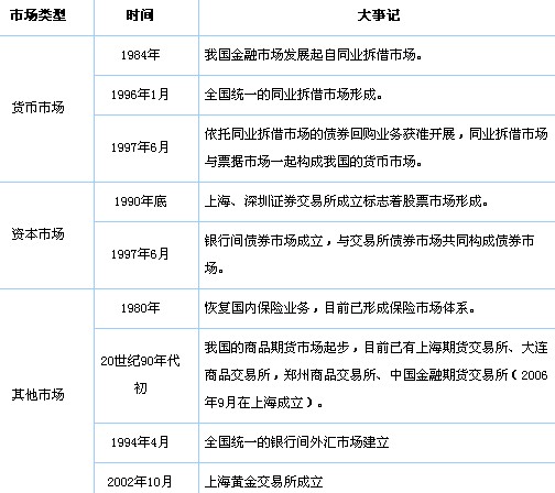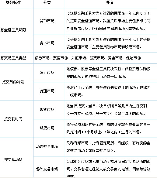 金融市場是金融工具交易的場所,主要包括貨幣市場、債券市場、股票市場、外匯市場、期貨市場、黃金市場、保險市場等。
