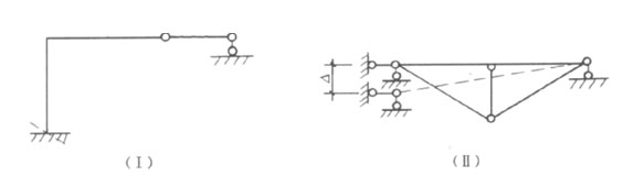 提示:(Ι)為靜定結(jié)構(gòu),(Ⅱ)為內(nèi)力超靜定結(jié)構(gòu),支座位移不影響內(nèi)部各桿的相對位移,不會產(chǎn)生內(nèi)力。