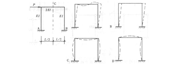 提示:圖示結(jié)材實際上可化為反對稱荷載作用在對稱剛架上,其位移也應(yīng)是反對稱的;同時剛結(jié)點處應(yīng)保持直角不變,只有A是對的。