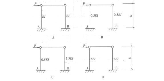 提示:不計橫桿的軸向變形,只須比較各圖中的右側(cè)柱即可。D圖中的右側(cè)柱剛度最大,而其根據(jù)剛度比所承擔(dān)的荷載又最小,故其柱頂水平側(cè)移最小。