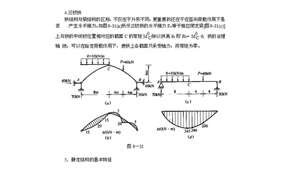 (3)三鉸拱。三鉸拱也是受彎結(jié)構(gòu),由于有水平推力,所以拱的截面彎矩比相應(yīng)簡支 梁的彎矩要小,利用空間也比簡支梁優(yōu)越,常用作屋面承重結(jié)構(gòu)(見圖9―31)。