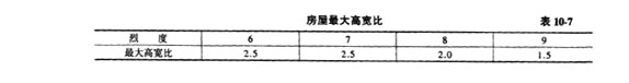 3.多層砌體房屋總高度與總寬度的最大比值,宜符合表10-7(《抗規(guī)》表7.1.4)的要求。