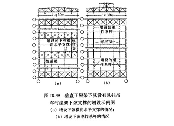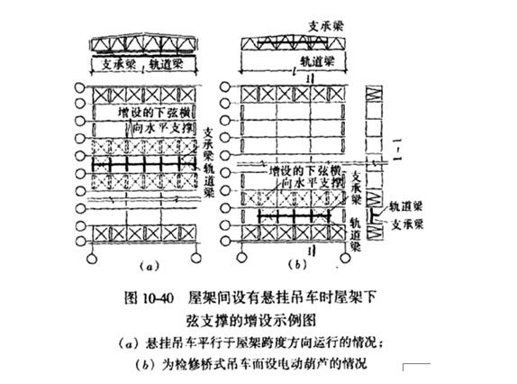 (2)當(dāng)懸掛吊車沿廠房橫向(平行于屋架跨度方向)運(yùn)行時(shí),應(yīng)在其兩側(cè)的相鄰屋架問內(nèi)增設(shè)下弦橫向水平支撐和在軌道兩端增設(shè)水平支撐(圖lO