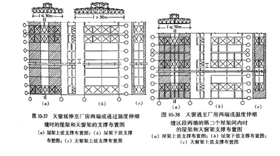 當(dāng)廠房設(shè)有天窗且天窗延伸至廠房盡端或通過溫度伸縮縫時(shí),屋架―上弦橫向支撐和下弦橫向水平支撐必須設(shè)在廠房兩端或溫度伸縮縫區(qū)段兩端的第一個(gè)屋架間內(nèi)(圖10-37)。