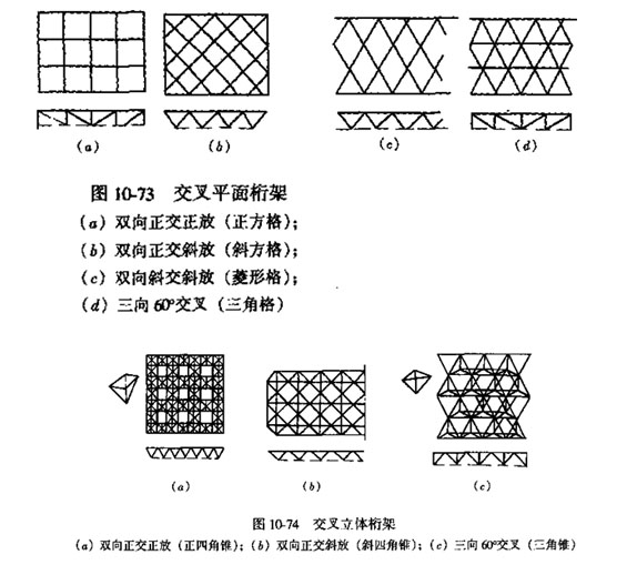 交叉立體桁架與交叉平面桁架不同,屬角錐體系,成為真正的空間桿件體系一空間桁架,見圖10-74。分以下三種: