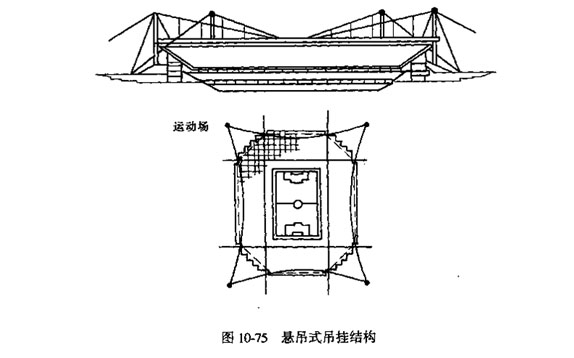 在條形高層建筑的兩端設(shè)置剛勁的豎向芯筒,多根主鋼索拉設(shè)于兩芯筒端部之間,呈懸鏈狀,在主鋼索以下懸吊各層樓蓋,均向上吊掛在鋼索上,即由鋼索兜著。兩芯筒頂端 之間乃剛勁結(jié)構(gòu),作為平衡主鋼索拉力的壓桿,詳見圖10―75。