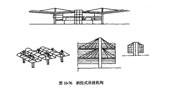 斜拉式:在建筑需要懸掛很大跨度,采用懸壁板、梁、桁架或殼都不經(jīng)濟(jì)時(shí),可采用斜拉索以減小構(gòu)件的跨度,達(dá)到減小截面、用料經(jīng)濟(jì)、屋蓋輕盈的目的。在塔形高層建筑中也出現(xiàn)了懸吊屋蓋與樓蓋。從一個(gè)或多個(gè)剛勁芯筒頂部,向四周伸出斜拉鋼索,吊掛住從芯核上部向四周懸挑的梁或桁架的外端,形成―個(gè)懸吊整個(gè)建筑物的主要承重結(jié)構(gòu)。在斜拉索的下端,即懸挑梁或桁架的外端,沿房屋四周向下懸掛豎向鋼索,各層樓蓋梁的內(nèi)端支于芯筒上,其外端支于豎向鋼索上,詳見圖10-76。